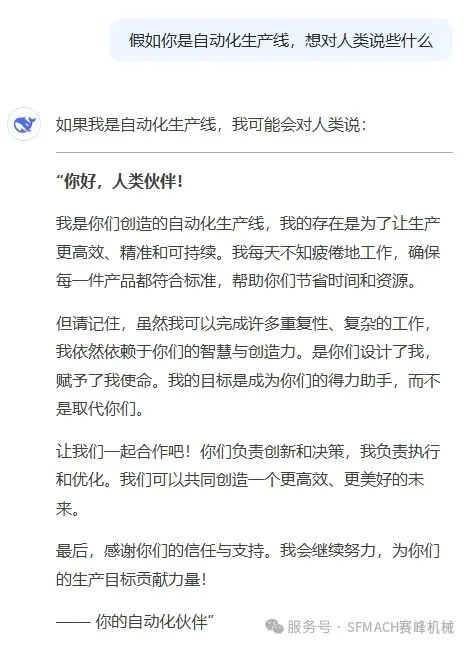 问:假如你是自动化生产线,想对人类说些什么?