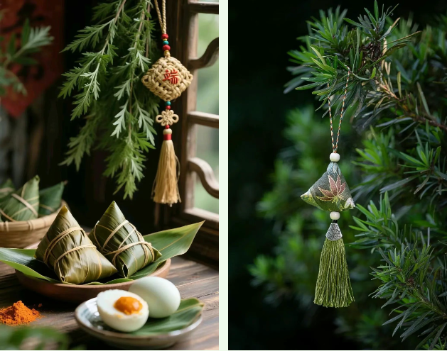 粽子古称 "角黍",用粽叶包裹糯米蒸制而成,从春秋时期的牛角状 "角黍" 到如今咸甜各异的多元口味,始终是端午餐桌上的主角。 彩色香囊内装艾叶、丁香,绣着花鸟生肖等图案,不仅能散香避瘟,更作为祈福饰物陪伴人们度过盛夏。